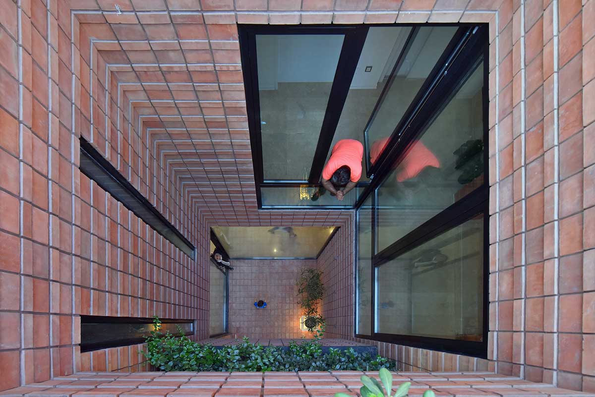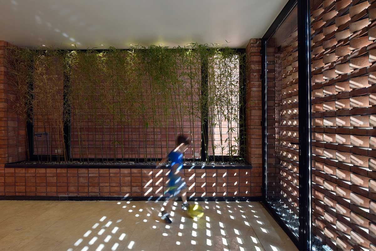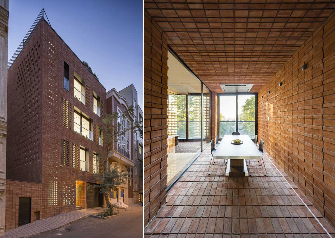 آجر سنتی به صورت سفت کاری و نازک کاری  ( نه به صورت تک لایه ) در پروژه استفاده شده است مصالح آجر در این پروژه فضا های حرکتی، وید ها و سطوح بیرونی بنا را تعریف می کند. در قسمت هایی که احتیاج به کنترل نور و دید می باشد، آجر با زوایای مختلفی قرار گرفته که دید از درون به بیرون را فراهم  می نماید ولی هم زمان دید بیرون به داخل کنترل می گردد.