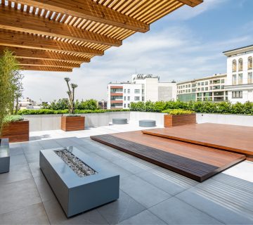 معمولاً بامهای ساختمانهای با متراژ کم با این چالش روبرو هستند که ساخت فضای سبز و نگهداری آن توجیه اقتصادی ندارد. مضاف بر این نداشتن متولی واحد، باعث از بین رفتن تدریجی این فضاها میشود. به همین خاطر تصمیم گرفتیم فضای بام را به دو قسمت تقسیم کنیم: یک قسمت برای تأسیسات ساختمان که قابل دسترسی برای تمام واحدهای ساختمان میباشد و قسمت دیگر یک حیاط آراسته با گلدان و فضایی برای نشستن، که قابل استفاده اختصاصی برای واحد پنجم ساختمان با دسترسی مستقل از داخل واحد است. با این رویکرد کیفیت متفاوت واحد پنجم بهواسطه نورگیری از سقف و رسیدگی مناسب به فضای بام تضمین شده است.تمان به حساب میآید را فراهم نموده است.